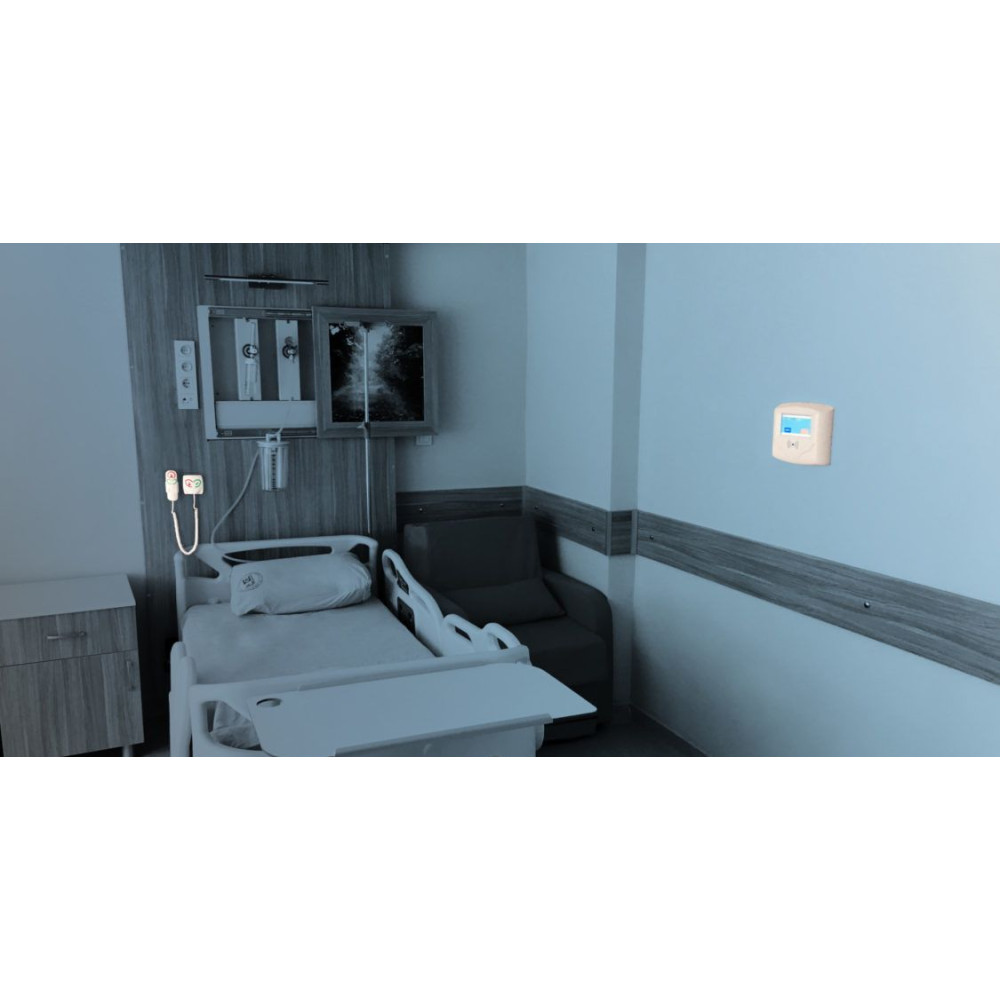 Это блок, который подает питание и управляет прикроватной кнопкой вызова медперсонала, блоком вызова из туалета и ванной, сигнальной лампой на двери в палате пациента, обычным управлением путем считывания карточек персонала, сине-розово-белым кодом, инициирование и завершение звонка от консультанта визуально и со звуком.