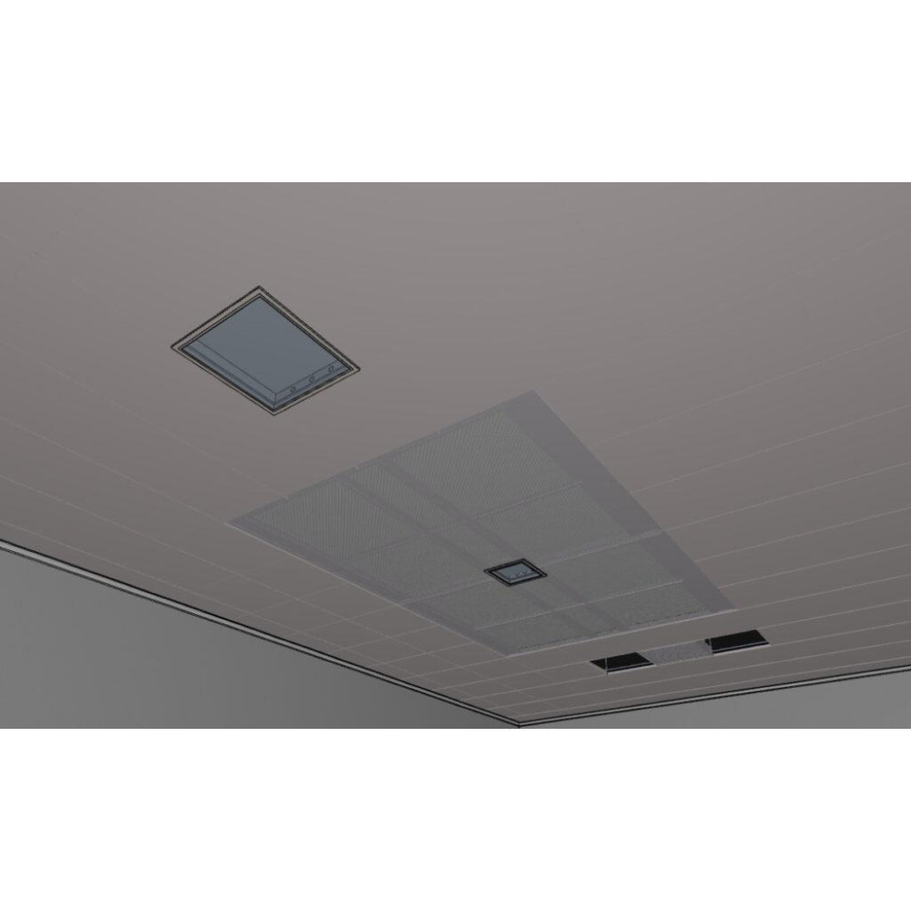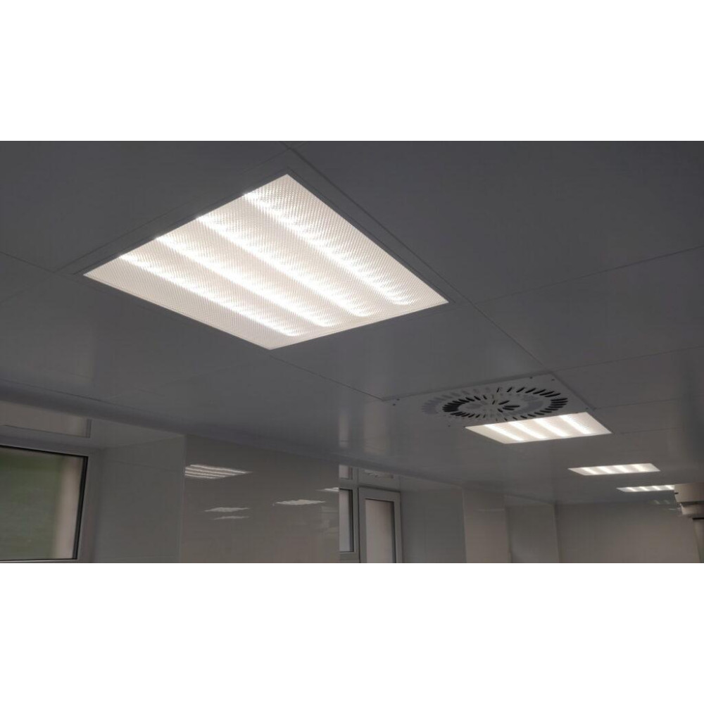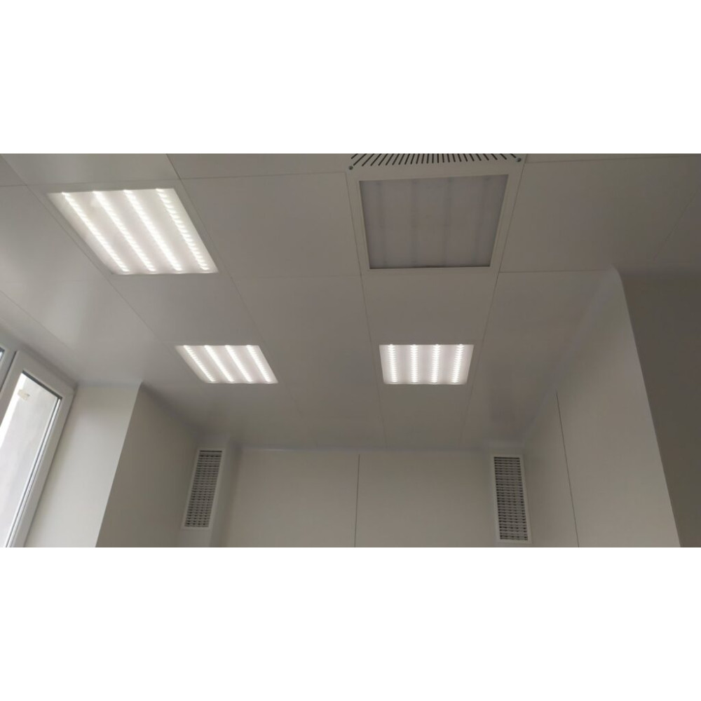 Светильники для чистых помещений типа «clip in» гарантируют 100% герметичность потолка, предотвращая проникновение воздуха. Корпус светильников изготовлен из стали с порошковым покрытием, а рассеиватель закрепляется на специальной рамке. Эта конструкция обеспечивает долговечность и эстетичный вид, идеально соответствующий цвету потолка.